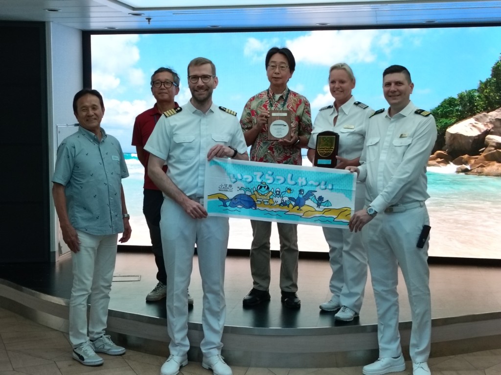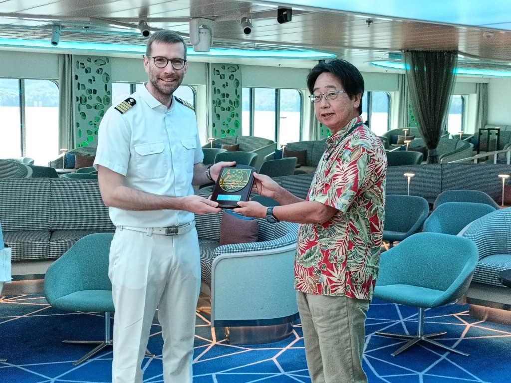 また、初寄港を記念して、東京都小笠原支庁の大場支庁長より船長へ盾の贈呈が行われました。