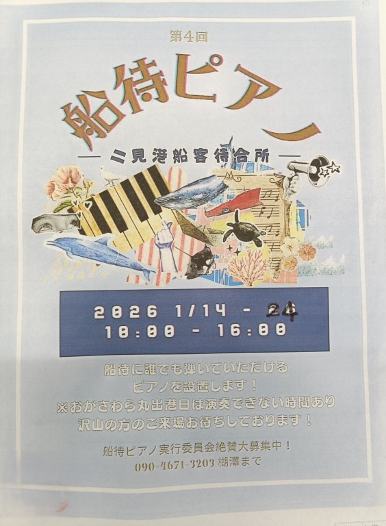 1月14日~1月24日まで、二見港船客待合所に「船待ピアノ」が設置されます。🎹