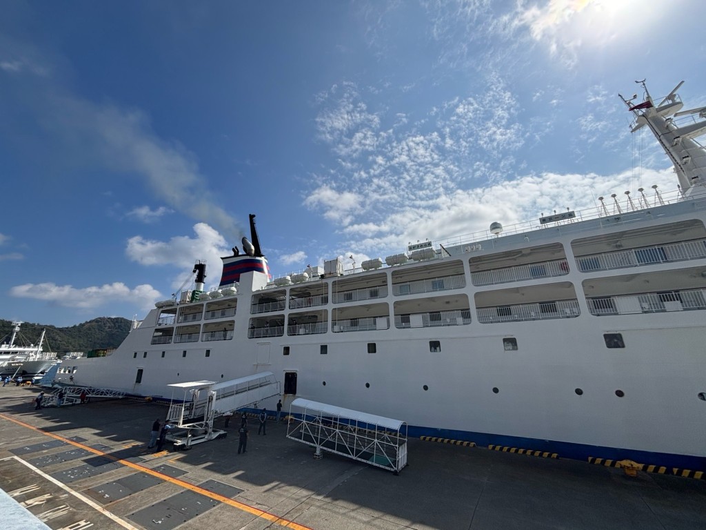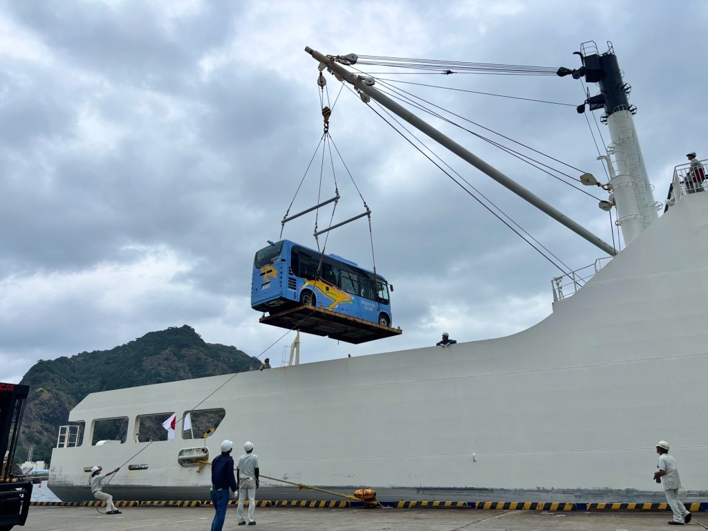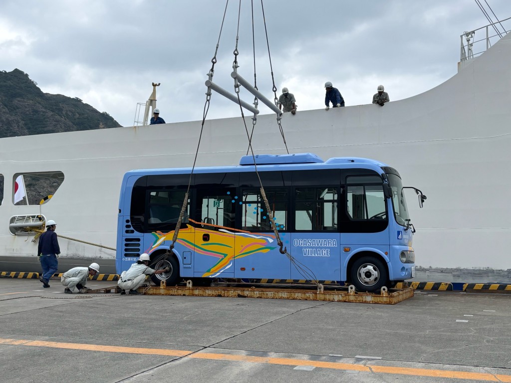 昨日、おがさわら丸が入港しました!竹芝出港時には、雪がぱらつく寒さだったようです。ようこそ小笠原へ! 荷台には村営バスの新車の姿がありました!大きなバスも小さく見えてしまうほど、おがさわら丸は大きいですね。鉄板の上に載せられ、ゆっくりと降りてきました。 メンテナンスを終え次第、順次運行を開始します。どうぞお楽しみに!また、現在運行中のナンバー「は330」は引退を予定しています。島内で見かけた際は、ぜひチェックしてみてください!